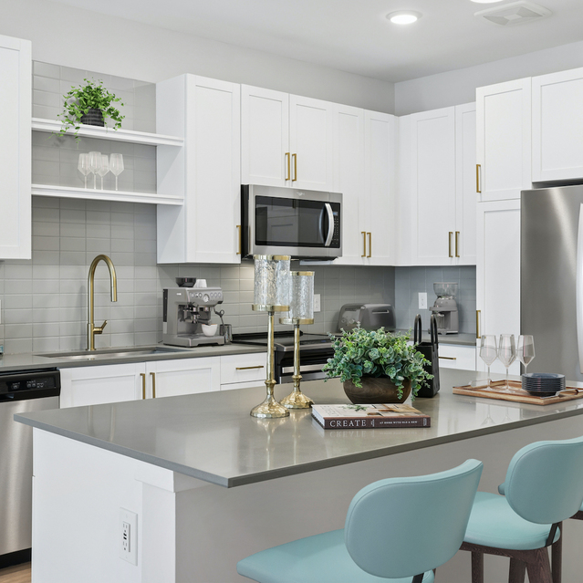Inside each apartment, clean-lined finishes and practical features come together seamlessly. Enjoy stainless-steel appliances, walk-in closets, front-loading washers and dryers, and expansive windows that frame skyline views. Beyond your front door, community spaces invite connection and relaxation. Start your day in the HIIT-inspired fitness center or settle into one of the coworking areas before heading out. When it’s time to unwind, relax in the rooftop garden, cool off in the saltwater pool or gather with friends in shared social spaces.